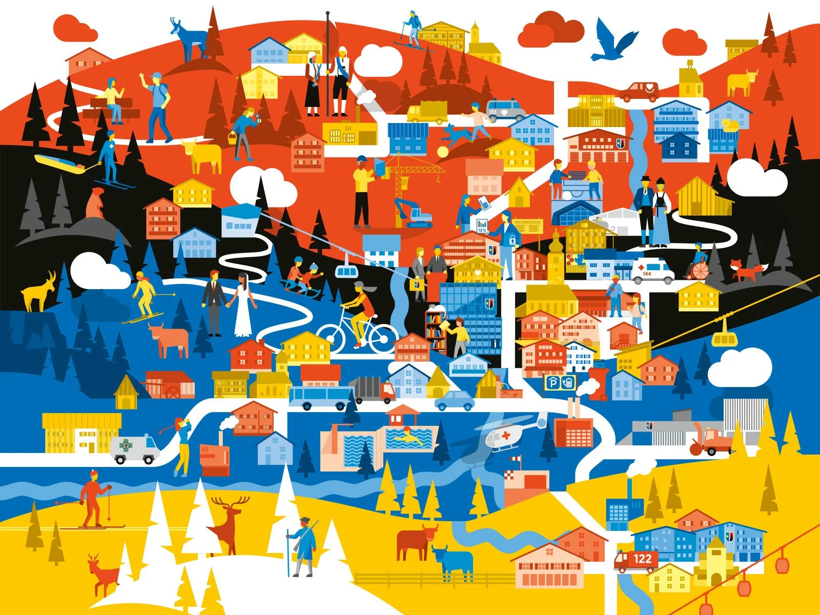 D: Wimmelbild–Illustration von Lech mit Inhalten und vielen Details die den Ort, Einwohner und Gäste betreffen. Im Auftrag der Gemeinde Lech.