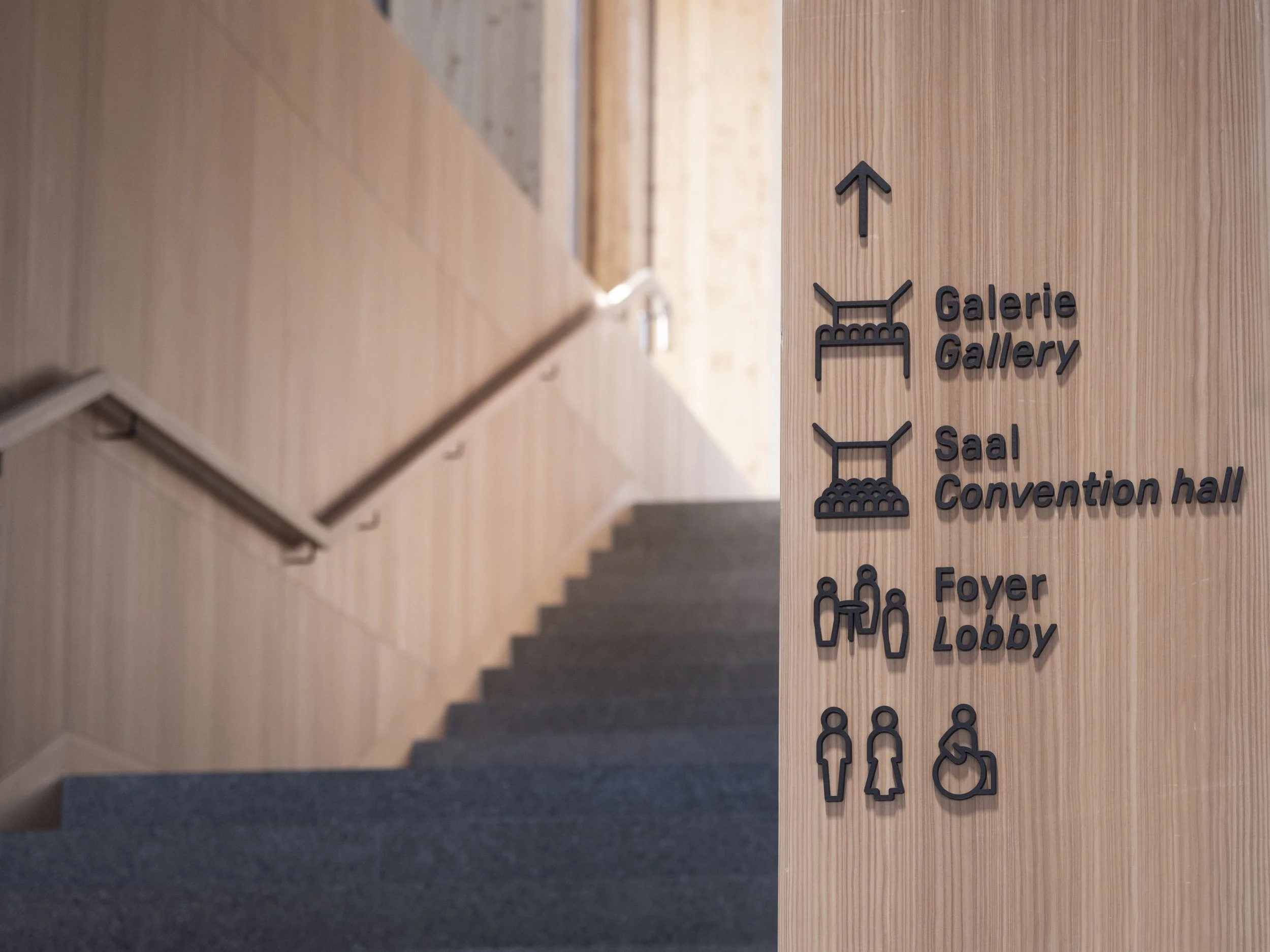 D: Orientierungssystem für das neue Gemeindezentrum in Lech: Dorfhus + Lechwelten, Untergeschosse (Lager, Küche, Technik, etc.), Tiefgaragen und dem unterirdischer Zugang zur Bergbahn Oberlech.