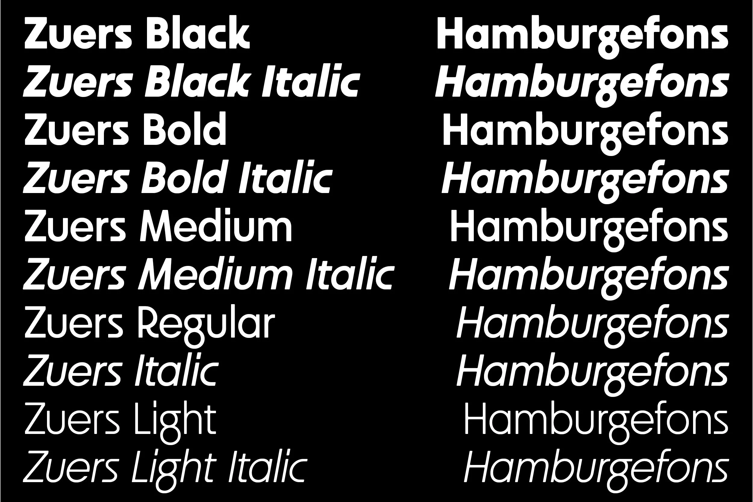 D: Zuers ist eine geometrische serifenlose Schrift, die aus 5 Schriftstärken besteht: Light, Regular, Medium, Bold und Black mit passenden Italics und zwei variablen Schriftarten (Roman und Italic). Jeder Schriftschnitt besteht aus 635 Glyphen.
